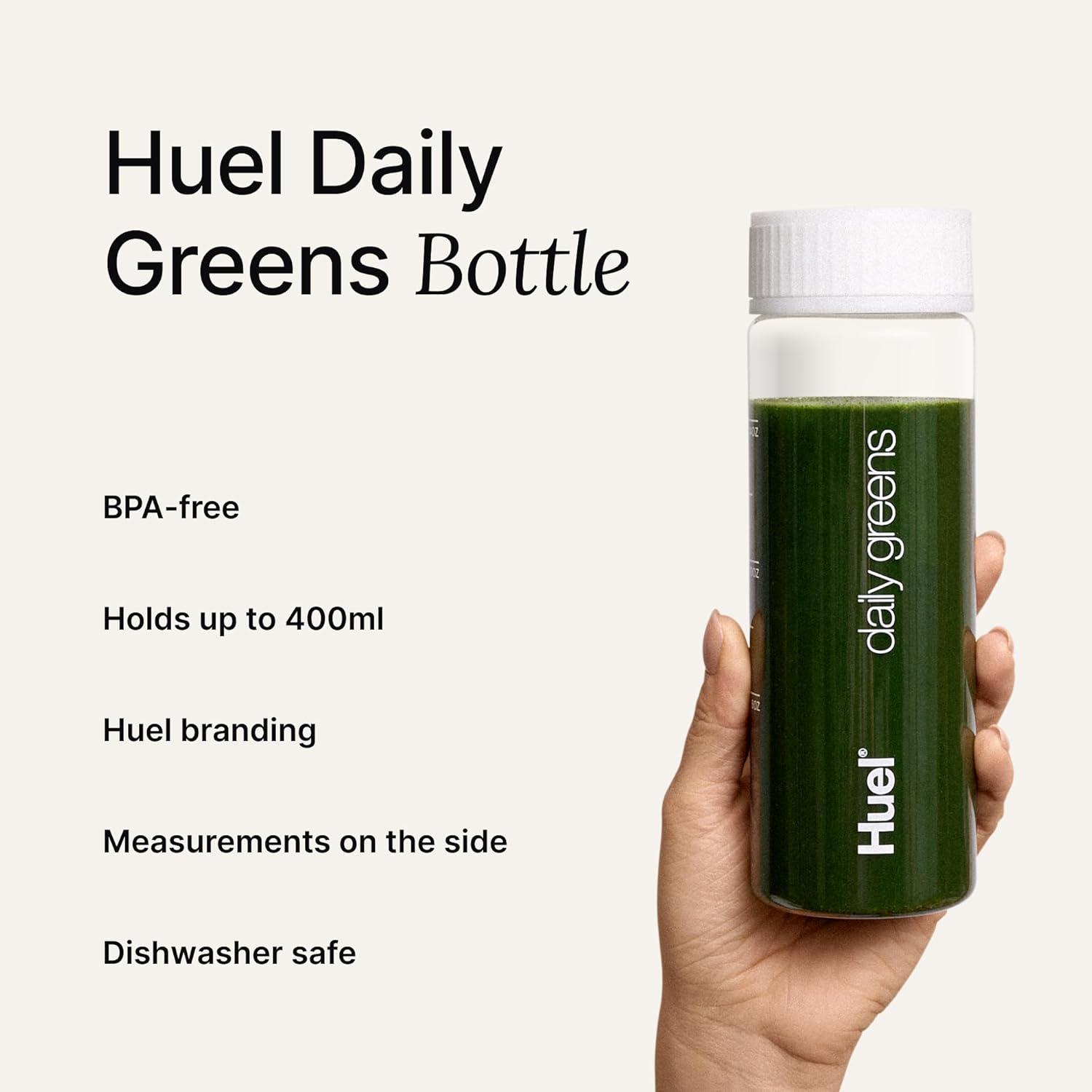 Huel Daily Greens Bottle | BPA Free | Clear with a White Lid | Fill line guide for perfect Measurements | Dishwasher Friendly | 13.5oz